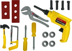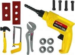 Součástí je simulovaná vrtačka, kladivo, pilka i kleště – všechno v provedení, které připomíná skutečné nářadí a podněcuje nápodobu dospělých.