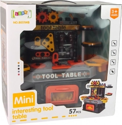 - Pracovní stolek s nástěnkou, úložné boxy, imadlo, pohyblivá ozubená kola, kladívko, šroubovák, šrouby a matice, háčky na nářadí, otevíratelný schovek, prvky k přišroubování, pracovní deska s otvory