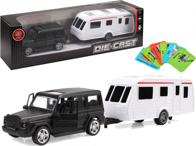 Objevte s naším setem dobrodružství na cestách! Díky jeepu a karavanu se mohou děti vžít do rolí řidičů a cestovatelů. Vytáhněte auto, pusťte ho a sledujte, jak jede vpřed. Jeep má otevírací dveře a obsahuje karty vozidel pro hraní a učení.