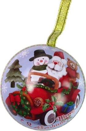 Tato kovová vánoční ozdoba spojuje dekoraci a praktické využití v jednom. Otevírací konstrukce umožňuje schovat do ní malé překvapení – od bonbonů po drobné dárky. Zelený povrch s ilustrací Mikuláše a sněhuláka v červeném autíčku podtrhne radostnou, zimní náladu.
