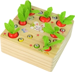 Každá mrkvička má jiný rozměr – děti je vkládají do správných otvorů a přirozeně rozvíjejí logiku a jemnou motoriku.