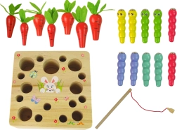 V balení najdete dřevěnou podložku s otvory, 6 mrkviček, 6 červíků a magnetickou udici. Každá mrkev má jinou velikost a patří do odpovídajícího otvoru, což podporuje třídění a jemnou motoriku. Magnet na konci udice umožní snadno „vylovit“ červíky – náhodně nebo podle barvy, což přidává prvky souhry, koncentrace a zábavné hry na zahrádku.
