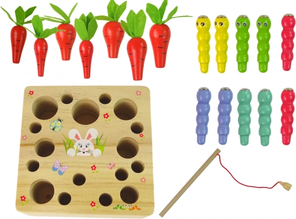 Kompletní sada s podložkou, 6 mrkvičkami, 6 červíky a udicí. Ideální dárek pro děti od 3 let.