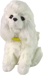 Heboučké bílé chloupky jsou mimořádně příjemné na dotek, tmavé oči s hnědým lemováním dodávají realistický vzhled a žlutý, snadno odnímatelný obojek podtrhuje roztomilý styl. Hračka je vhodná od 3 let, neobsahuje ostré části a splňuje bezpečnostní normy.