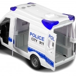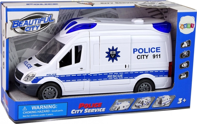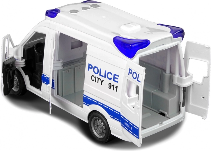 Zábavný policejní vůz pro děti s efekty světla a zvuku, otevíracími dveřmi a frikčním pohonem pro snadnou jízdu bez baterií v kolech. Realistické detaily, gumové pneumatiky a modré majáky zaručí hodiny kreativní hry.
