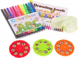 Tři disky po osmi obrázcích (zvířata, vozidla, ovoce a zelenina) a sada 12 fixů s blokem a houbičkou umožní dětem ihned začít tvořit bez dalších dokupů.