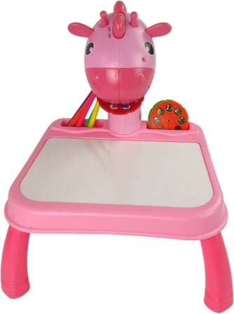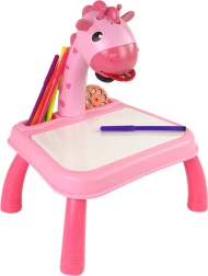 Růžový dětský projekční stolek se žirafou promítá 24 motivů, usnadňuje obkreslování a učení kreslení. V balení je 12 barevných fixů, sešit a houbička. Nechybí světlo a 12 melodií, suchý stírací povrch a nastavitelná ostrost pro hladké a kreativní tvoření.