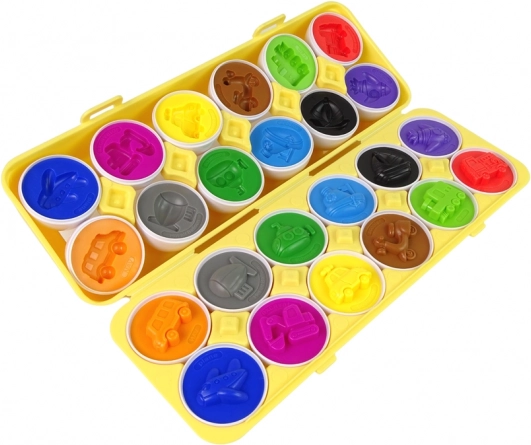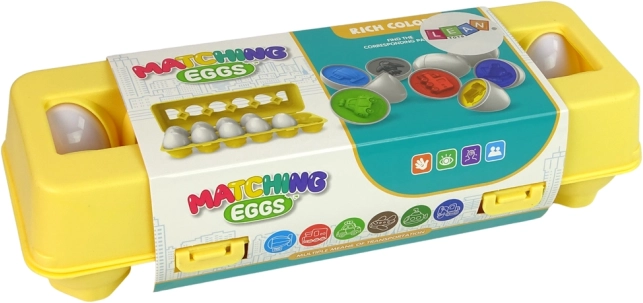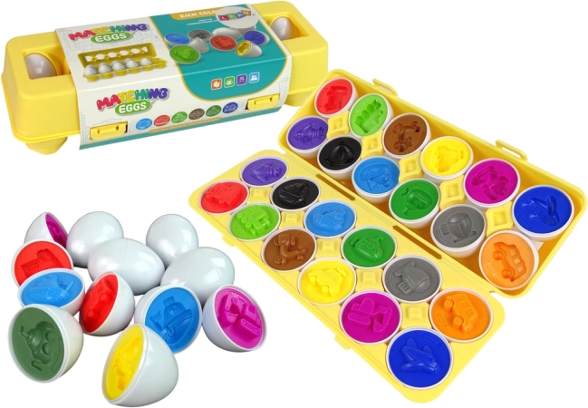 Zábavná vzdělávací hra pro děti: set 12 vajíček s motivem vozidel, která se spojují a třídí podle tvaru a barvy. Podporuje jemnou motoriku, koordinaci oko–ruka a logické myšlení. Vyrobeno z bezpečných, odolných materiálů, v praktické uzavíratelné krabičce ve tvaru plata na vejce.