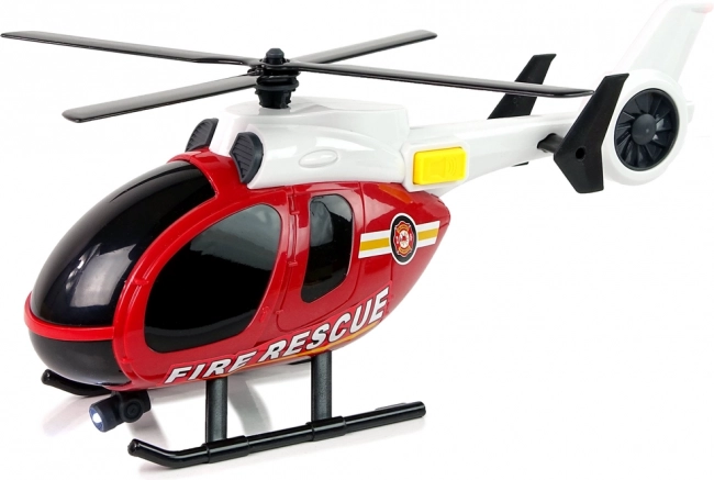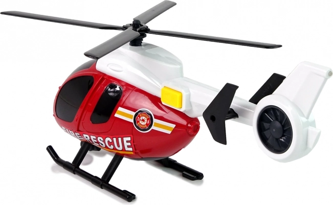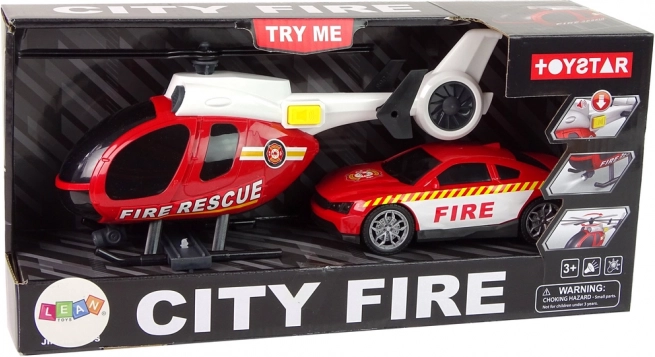 Tato záchranářská sada CITY FIRE přináší dětem vše, co potřebují pro jejich vlastní hasičské zásahy. Velká helikoptéra s nápisem FIRE RESCUE má ručně otáčivé vrtule s rozpětím cca 20 cm a po stisknutí bočního tlačítka spouští světla a zvuky startu a letu. Sportovní hasičské auto s gumovými pneumatikami a výraznými potisky jede hladce po rovném povrchu a doplňuje akční scénáře.
