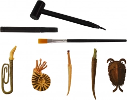 - 1 starověké stvoření (náhodný druh), dláto, štěteček, kladívko, sádra, houbička ve tvaru dinosaura