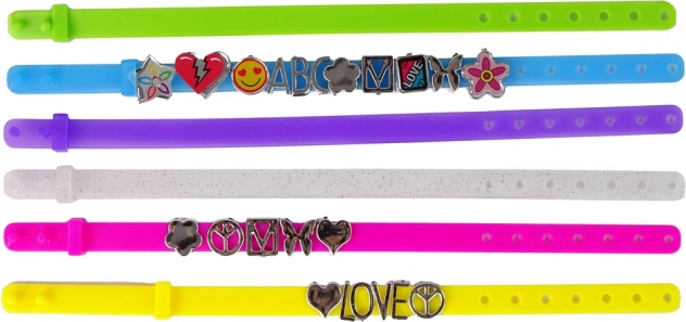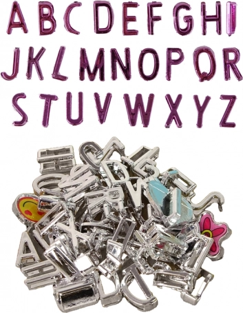 Obsahuje písmena od A do Z, různé tvary a 6 náramkových pásků s jednoduchým zapínáním.