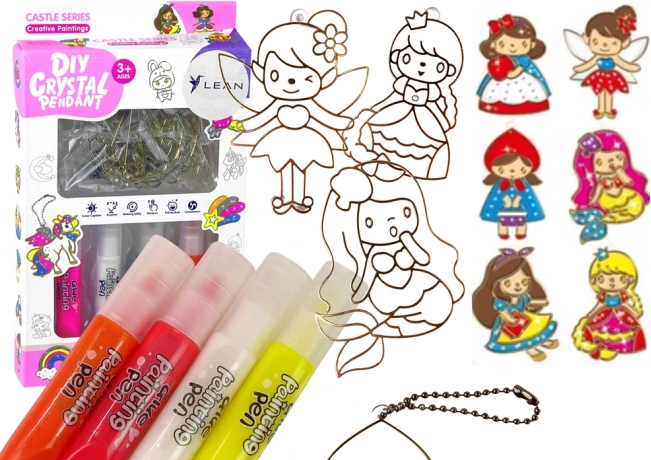 Šest průhledných motivů princezen připravených k vybarvení promění každé odpoledne v kreativní dílnu a rozsvítí okna či batohy originálními přívěsky.