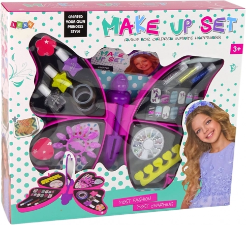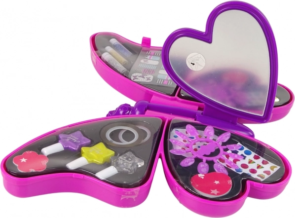 Srdcem sady je rozkládací kazeta ve tvaru motýla. Uvnitř najdete přehledné přihrádky na laky, třpytky, kamínky i doplňky a zrcátko pro snadné líčení a zdobení.