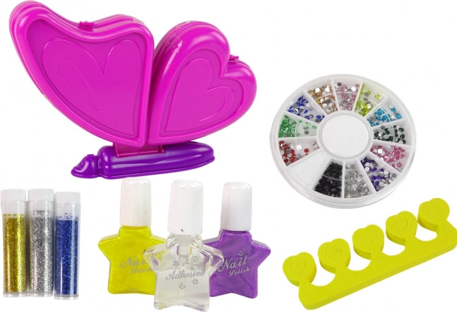 Kombinujte tři barvy laků se sypkými třpytkami, samolepkami a kamínky. Separator prstů a pilník ve tvaru srdce pomohou k přesnému a pohodlnému zdobení.