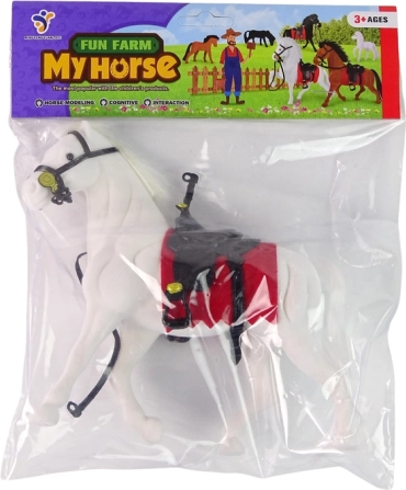Realistická figurka bílého koně s černým sedlem a červeným čabrakem pro malé milovníky stájí a farmy. Vyrobena z kvalitního, na dotek příjemného materiálu, s dlouhou hřívou a ocasem ideálními na česání a zaplétání. Skvělý doplněk do dětské kolekce figurek a pro kreativní hraní od 3 let.