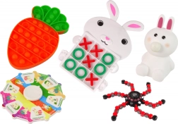 Tato bohatá velikonoční sada fidget hraček přináší zábavu i smyslovou stimulaci pro děti od 3 let. Najdete v ní pop it ve tvaru mrkve, králičí gniotky i skládací vajíčka – vše v bezpečném, netoxickém provedení a v zářivých barvách. Hračky jsou ideální pro odreagování, rozvoj koordinace oko–ruka a trénink soustředění.