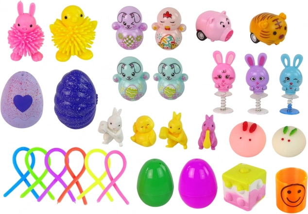 - senzorická kostka, skládací kostka, 4 figurky (králík, kuřátko), 6 plastových figurek (králík, kuřátko), hra piškvorky, 2 mačkací králíci, 6 gumových hadů, 3 skákací hračky, 2 překvapení ve vajíčku, 2 natahovací autíčka (tygr, prasátko), pružina, 2 otevírací skládačky ve vajíčku, 2 gumoví králíci–gniotci, rozvíjecí hračka, přívěsek králík pop it