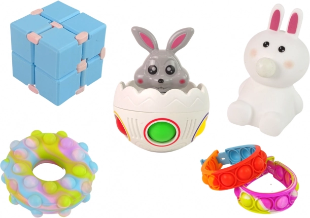 Pop it donut, náramky, králíček a vajíčko, mačkací figurky i fidget kostka – perfektní pro smyslovou hru a uvolnění stresu.