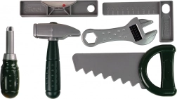 Sada obsahuje: vrtačku, kladivo, pilu, klíč, šrouby, matice a dřevěnou desku na šroubování komponentů. Všechny nástroje jsou vyrobeny z bezpečného plastu, vhodného pro děti od 3 let.