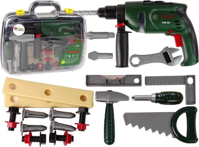 Pořiďte svým dětem zábavný zážitek s naší dětinskou nářaďovou sadou. Obsahuje realistickou plastovou vrtačku s otočnou funkcí a autentickým zvukem, což udělá radost každému malému kutilovi. Všechny nástroje a příslušenství jsou uloženy v praktičí průhledné plastové maletce, což usnadňuje skladování a přenášení.
