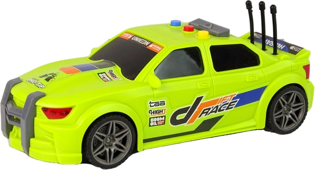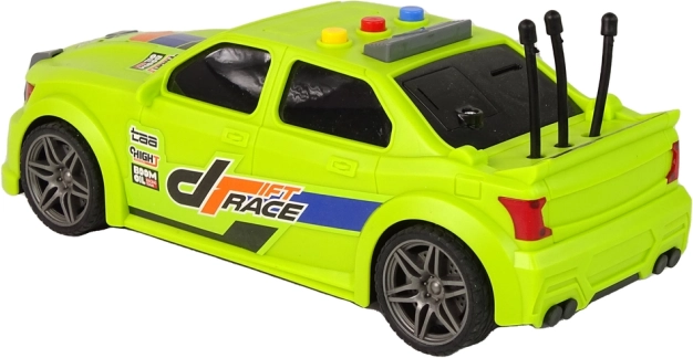 Neonově zelená karoserie s atraktivními polepy „Drift Race“, sportovní disky a nízký profil dávají autu autentický závodní vzhled, který děti okamžitě zaujme.