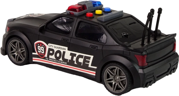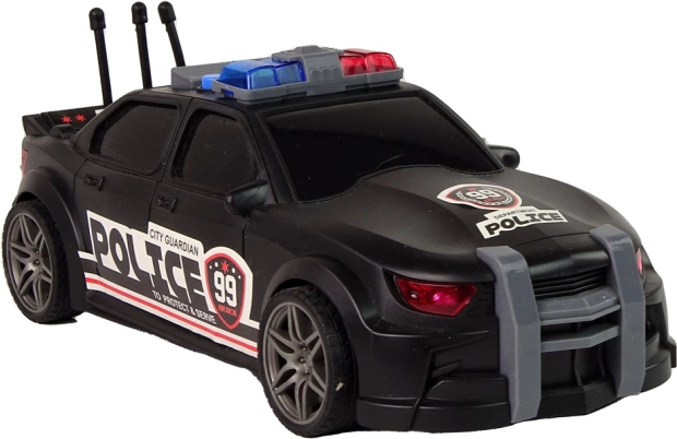 Černé sportovní provedení s nápisy POLICE, modro-červenými majáky a anténami dodává hračce realistický vzhled.