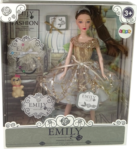 Objevte kouzlo módního světa s panenkou EMILY. Její třpytivé zlaté šaty se stuhou v pase, upravený účes a černé botičky s ozdobou dělají z této panenky elegantní společníci pro každodenní hraní. Modré oči a jemné detaily dodávají realistický a půvabný vzhled.
