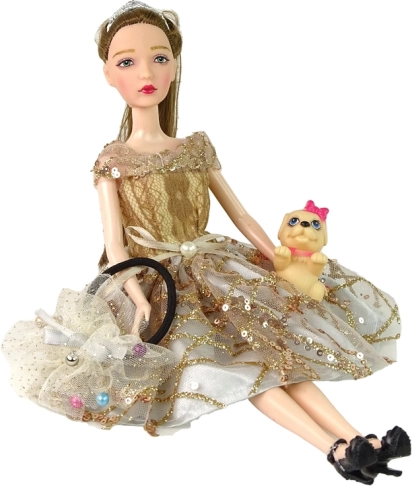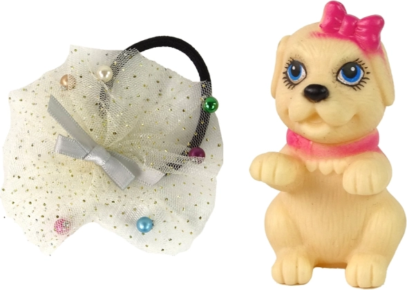 Součástí balení je malý béžový pejsek s mašličkou a zdobená gumička do vlasů, které doplní herní scénáře i stylingové proměny. Set je skvělý pro rozvoj jemné motoriky, role-play a příběhové hry.