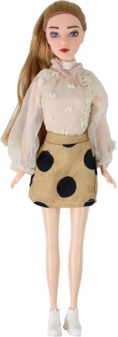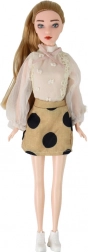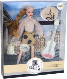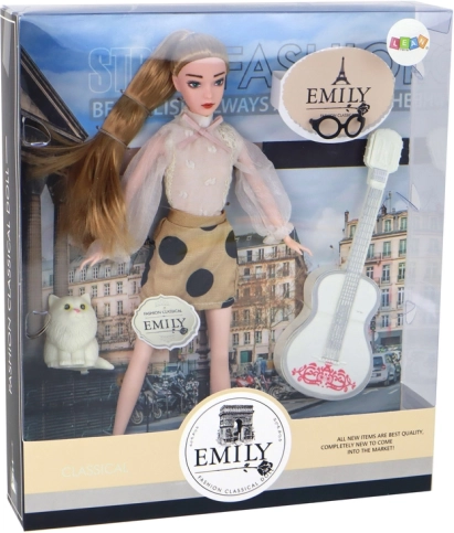 Panenka Emily okouzlí elegantním vzhledem: průsvitná bílá halenka s detaily, hnědá sukně s černými puntíky a bílé tenisky. Dlouhé blond vlasy učesané do culíku doplňují černé brýle. Bílá kytara s růžovým zdobením zve ke kreativní hře a vyprávění vlastních příběhů s věrným koťátkem po boku.