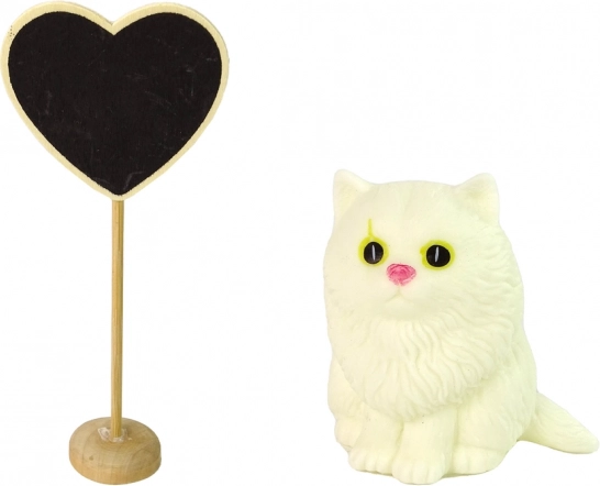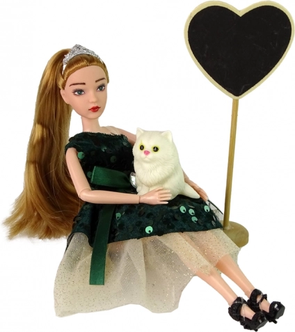 Součástí sady je bílé koťátko s píšťalkou pro veselé zvukové efekty a dekorativní dřevěné srdce na stojánku, ideální jako kulisa k hernímu „molu“. Set je skvělým dárkem pro malé milovníky panenek a módy.