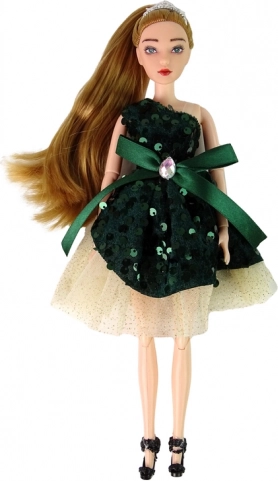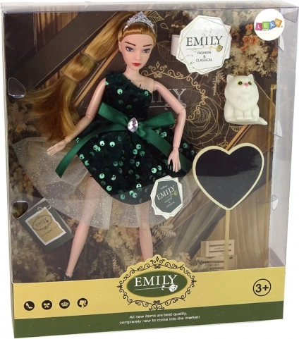 Vdechněte dětské hře kouzlo s panenkou Emily – elegantní panenkou s dlouhými blond vlasy, zlatou tiárou a šaty se zelenými flitry. Pohyblivé končetiny umožňují přirozené pózování a snadné inscenování módních přehlídek i příběhů.