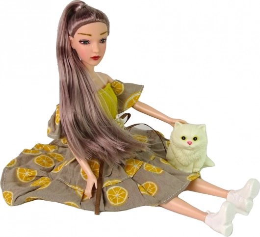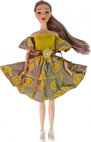 Panenka Emily má dlouhé vlasy, krásné šaty se vzorem citrusů a bílé botičky. Kloubové končetiny umožňují přirozené pózy.