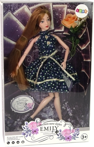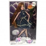 Stylová panenka Emily s dlouhými hnědorudými vlasy a modrýma očima okouzlí malé milovnice módy. Má kloubové končetiny pro realistické pózování, nosí tmavé šaty s květinovým vzorem a lodičky na podpatku. Součástí je i dekorativní růže. Ideální velikost do dětských rukou a skvělé jako dárek.
