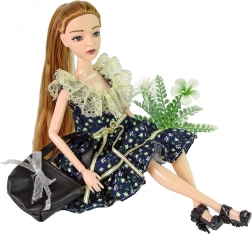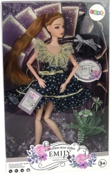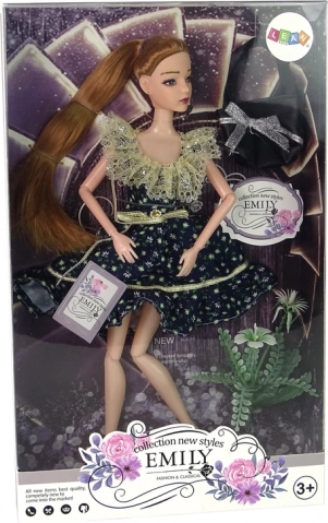 Objevte svět módy s panenkou EMILY – ideální volbou pro kreativní hry, domácí módní přehlídky i každodenní příběhy. Panenka je oblečena do krásných tmavě modrých šatů s bílými kvítky a ladících černých lodiček na podpatku. Dlouhé vlasy vybízejí k česání a tvorbě účesů, zatímco pohyblivé končetiny umožňují přirozené pózy jako na skutečném mole.