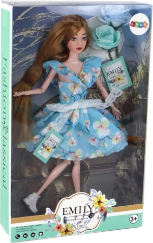 Panenka Emily (30 × 7 × 4 cm) je ideální společnící pro každodenní hraní. Dlouhé vlasy v odstínu tmavé blond lze snadno česat a zdobit, takže si děti mohou vytvářet nespočet účesů. Modré šaty s květinovým vzorem zdobí krajková mašlička a drobný „diamantový“ detail u výstřihu, který dodává panence elegantní vzhled.