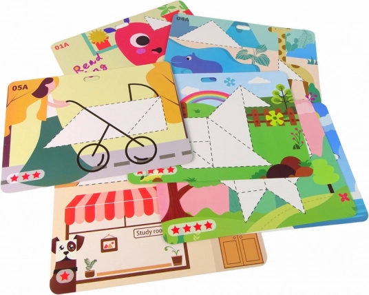 Zahrnuje také návod s návrhy tvarů a úkoly, aby hra byla jak příjemná, tak rozvíjející. Děti mohou experimentovat a učit se při objevování nových vzorů, čímž podporují svou schopnost řešit problémy a trpělivost.