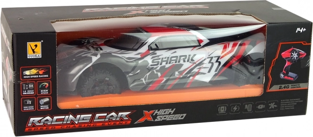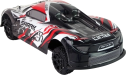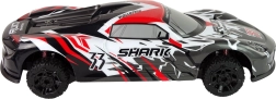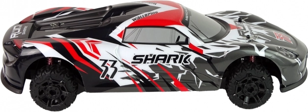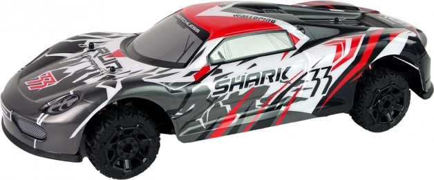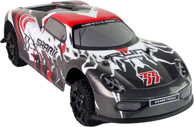 Sportovní RC model s aerodynamickým designem SHARK vyniká skvělou přilnavostí a stabilitou. Odpružení na nerovnostech udržuje plynulou jízdu, zatímco široká gumová kola se postarají o jistý záběr i na horším povrchu. Ovladač s pistolovou rukojetí umožňuje přesné řízení vpřed/vzad i plynulé zatáčení.