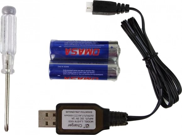 - Kompletní set – auto, ovladač, akumulátor, USB nabíječka, baterie, šroubovák, návod.