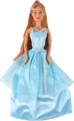 Panenka je oblečená v dlouhé, třpytivé modré šaty s tylovým přehozem a jemnými stříbrnými akcenty. Ideální pro královské dobrodružství.