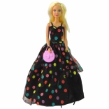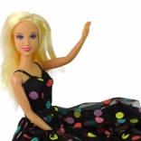 Panenka DEFA LUCY přináší elegantní styl a jemné detaily, které potěší každého malého milovníka módy. Dlouhé, lehce vlnité blond vlasy, dlouhé černé šaty s barevnými puntíky a sladěné doplňky vytvářejí harmonický a hravý vzhled. Jemné líčení očí v modro‑růžových tónech a růžové rty podtrhují její kouzlo.