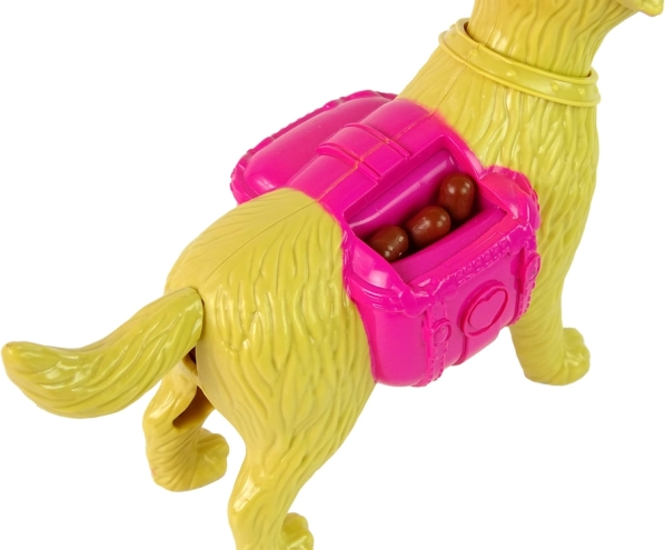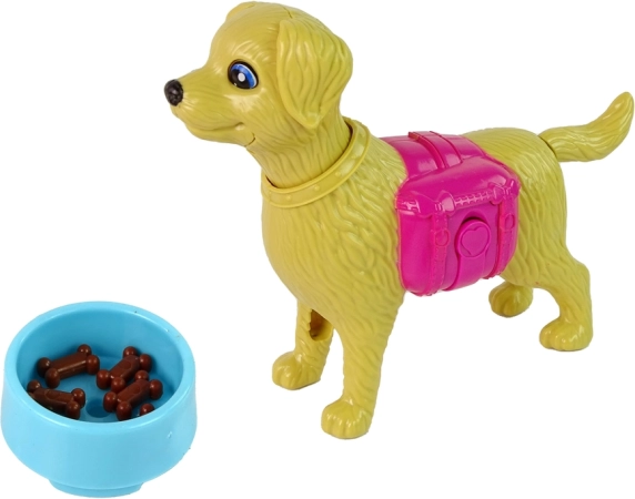 Žlutý psík má pohyblivý ocásek, uši a tlamu. Díky růžovému zásobníku a misce s granulemi můžeš pejska znovu a znovu krmit a rozvíjet fantazii.