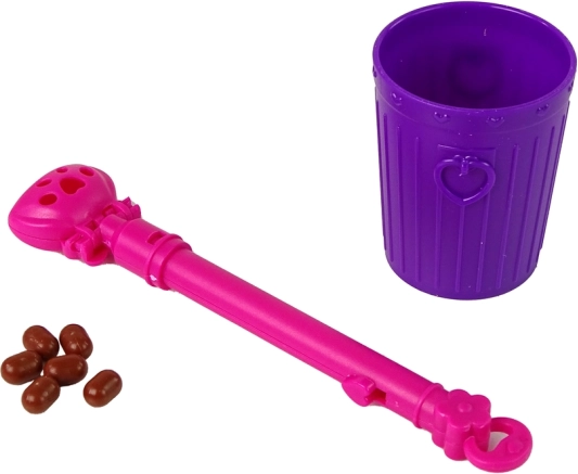 - Loutka, pejsek, růžové vodítko, koš na odpadky, miska s krmivem, lopatka