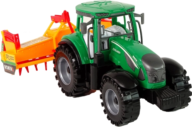 Tento detailně zpracovaný traktor v zelené barvě s připojitelným oranžovo-červeným kultivátorem přináší dětem autentický zážitek z farmy. Realistické pneumatiky, otevřená kabina a funkční příslušenství podporují kreativní hru a rozvoj fantazie.