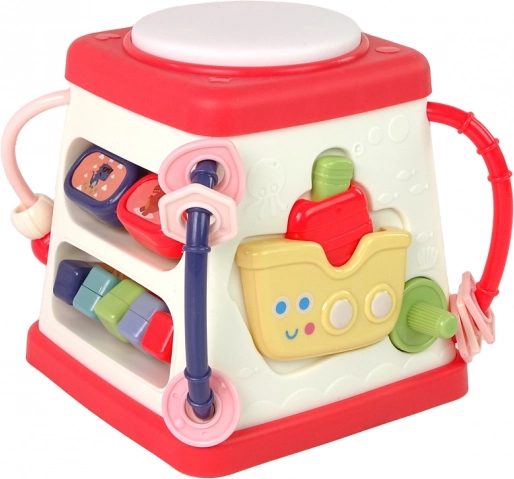 - Světelné efekty, melodie, zvuky zvířat, anglická slovíčka, ozubená kolečka, korálky, loďka na otočné páčce, tvary k procvičování motoriky