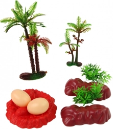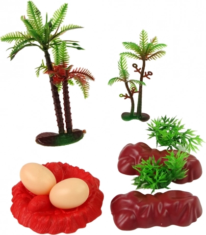 Doplňky tvoří dva kameny, dva keře, dva stromy a dvě dinosauří vejce s podstavcem, které dotvářejí autentické scénáře a zvyšují kreativní potenciál hry. Tato sada je navíc vyrobena z trvanlivého plastu, což garantuje její dlouhou životnost a odolnost vůči dětským dobrodružstvím.