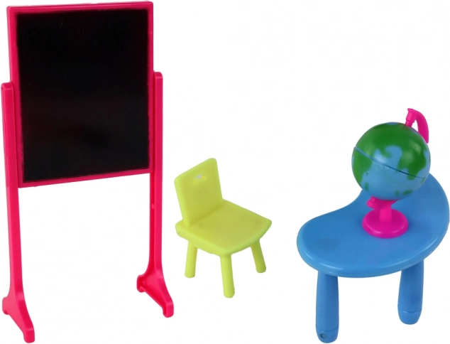 Set obsahuje plastovou tabuli a globus, které podporují vzdělávání a objevování světa. Díky tomu přispívají k rozvoji dětské fantazie a kreativity. Děti mohou využít tento set k inscenaci různých školních scén a situací, čímž se zabaví a učí zároveň.