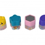 Čtyři různé otvory pro třídění tvarů a barev, podporující rozvoj rozpoznávání tvarů a barev.