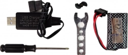 - RC člun 2,4 GHz (červený), dálkový ovladač, akumulátor s USB nabíjením, antikolizní kryt, náhradní vrtule, klíč, šroubovák, stojánek, návod
