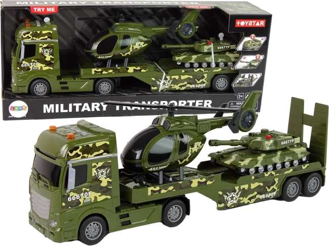 Tento detailně zpracovaný set přináší tři oblíbená vojenská vozidla v jednotném maskovacím designu: nákladní vůz s odpojitelným přívěsem, vrtulník s otáčejícími se rotory a tank se setrvačníkem. Díky realistickým detailům, pohyblivým částem a světelně‑zvukovým efektům si děti snadno vytvoří vlastní dobrodružné mise.