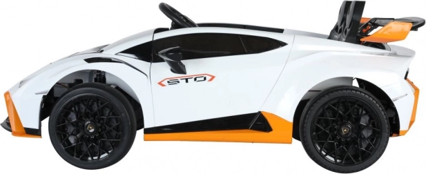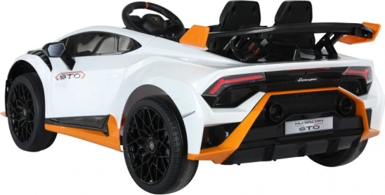 Karoserie v bílé barvě s oranžovými akcenty, funkční přední světla a detailní kola vytvářejí dojem skutečného LAMBORGHINI STO.